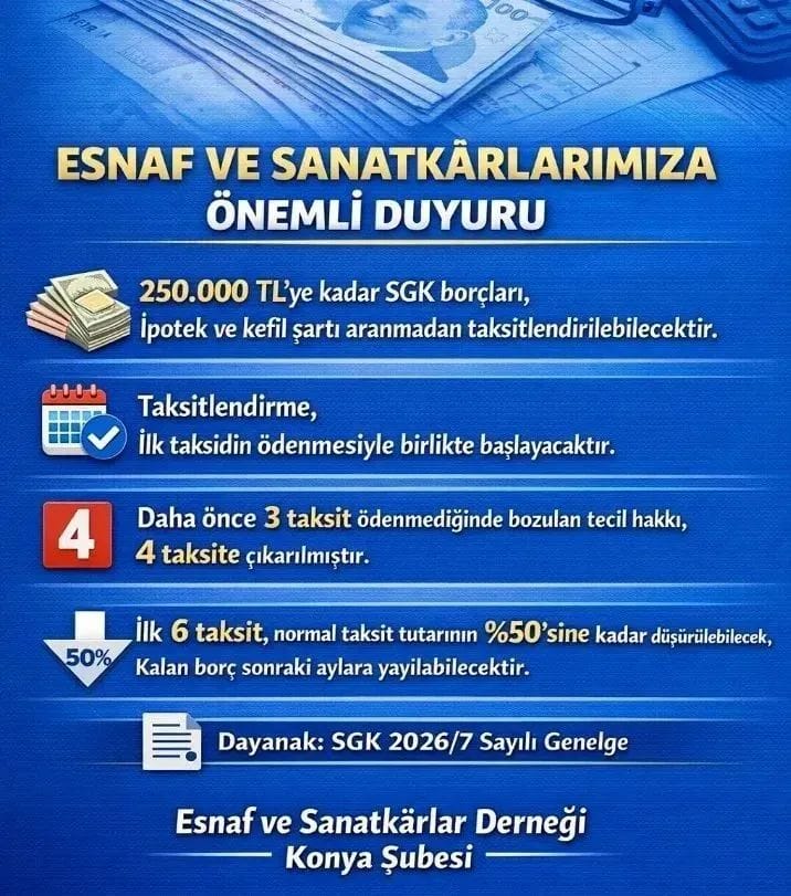 Esnaf ve sanatkârları yakından ilgilendiren önemli bir düzenleme yürürlüğe girdi. Sosyal Güvenlik Kurumu (SGK), 2026/7 sayılı genelge kapsamında esnafın birikmiş pr